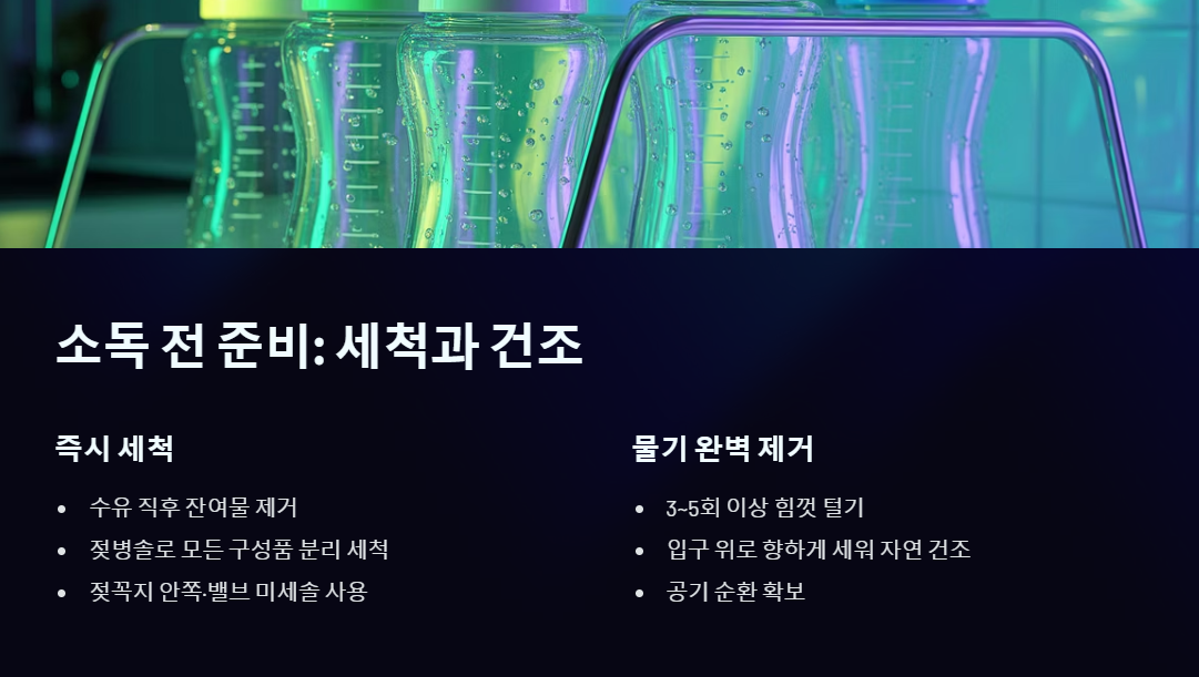 - 충분히 털어내기: 젖병을 세척 후 흐르는 물에 헹구고, 최소 3~5회 이상 물기를 힘껏 털어 내부의 큰 물방울을 제거합니다.