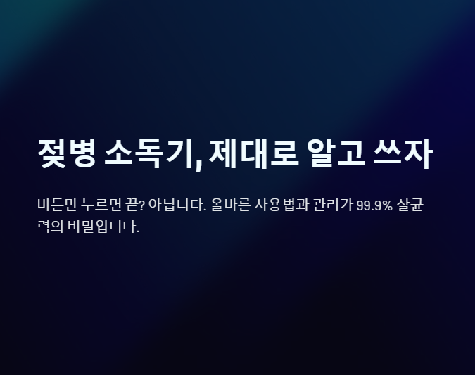 젖병 소독기는 육아의 수고를 덜어주고 아기의 위생을 지켜주는 고마운 존재입니다. 하지만 이 편리함 뒤에는 사용자의 세심한 관리와 올바른 사용법이 필수적으로 요구됩니다. 세척 후 물기를 완벽히 제거하고, 젖병은 입구를 위로 향하게 세워서 UV 빛이 닿는 면적을 최대화하며, 주기적으로 스팀타월을 이용해 내부 물때를 깨끗하게 닦아내는 것. 이 세 가지 핵심 원칙만 지킨다면 젖병 소독기의 99.9% 살균력을 온전히 활용할 수 있습니다. 젖병 소독기를 통해 건강하고 깨끗한 육아 환경을 만드시길 바랍니다.