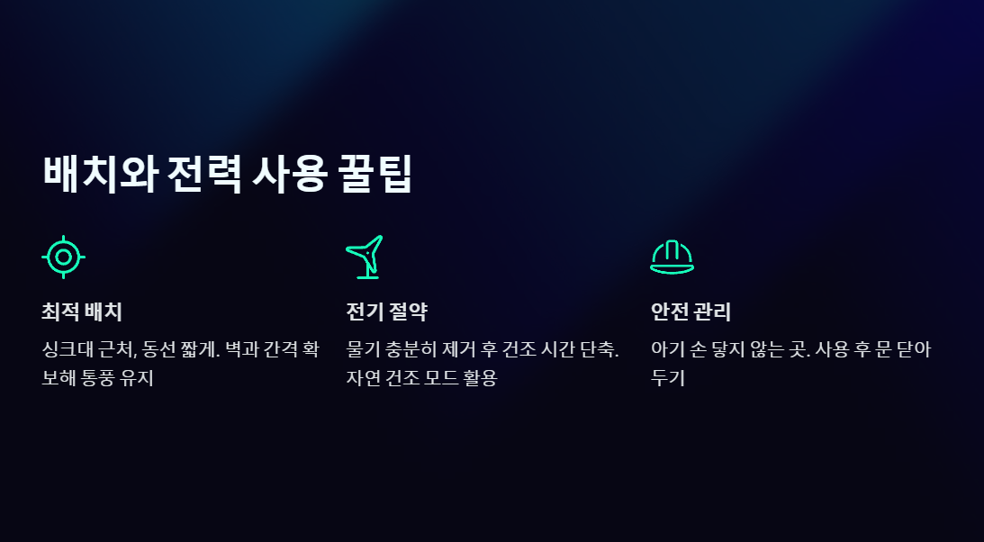- 안전 관리: 아기의 손이 닿지 않는 곳에 설치하고, 사용 후에는 문을 닫아두는 것이 좋습니다.