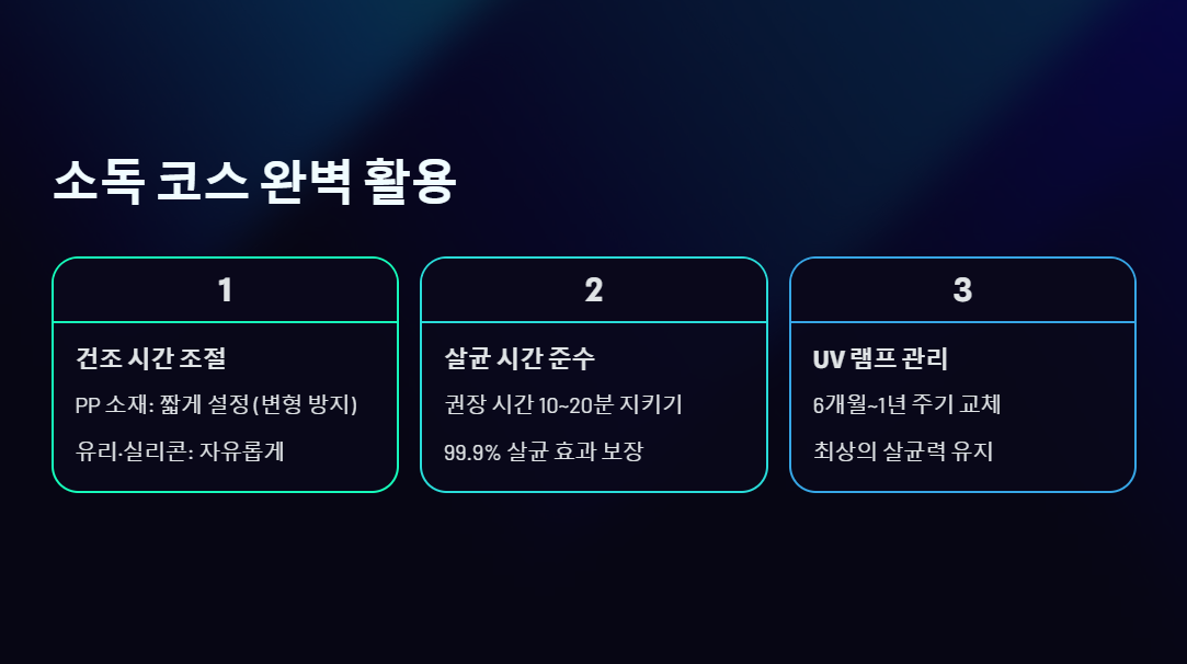 - 권장 시간 준수: 제품 설명서에 명시된 권장 살균 시간(보통 10분~20분)을 지켜야 99.9% 이상의 살균 효과를 얻을 수 있습니다. 너무 짧은 시간은 소독 불량으로 이어집니다.