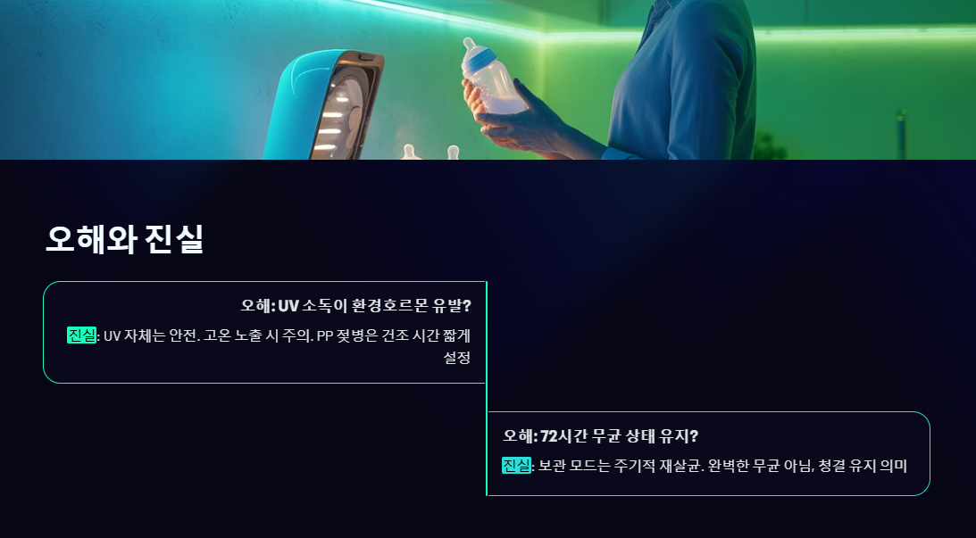 - 진실: 젖병 소독기에는 보통 '보관/청정 모드'가 있어 일정 시간(예: 72시간)마다 UV 살균을 자동으로 재실행합니다. 이는 소독 상태를 유지하기 위함이지, 젖병이 완벽한 무균 상태로 72시간 동안 보존된다는 의미는 아닙니다. 젖병이 필요할 때 깨끗하게 보관되어 있음을 의미합니다.