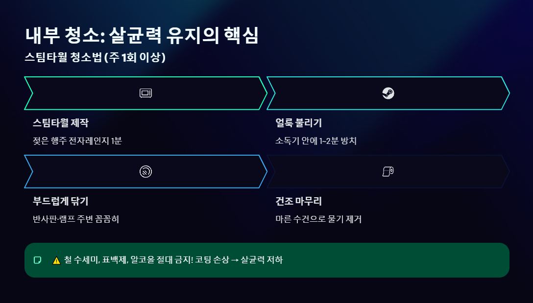 - 부드러운 닦아내기: 불어난 얼룩을 스팀타월로 부드럽게 닦아냅니다. 절대 철 수세미나 표백제, 알코올 등 화학 세제를 사용하지 마세요. 내부 코팅이나 반사판에 손상이 가 살균력 저하 및 고장의 원인이 될 수 있습니다.