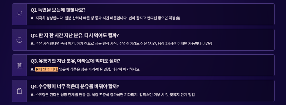 A1. 네, 지극히 정상입니다. 분유 속 철분이 산화되거나 장 통과 시간이 빠를 때 녹변이 나타날 수 있으며, 변이 찰지고 아이 컨디션이 좋다면 걱정하지 않으셔도 됩니다.