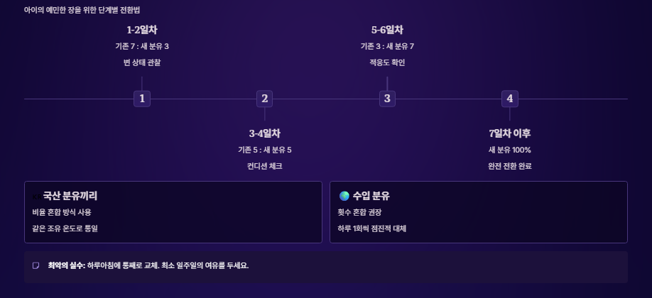 국산 분유끼리는 보통 비율 혼합 방식을 씁니다. 첫날은 기존 분유 7, 새 분유 3의 비율로 섞어 먹이고, 며칠에 걸쳐 새 분유의 비중을 높여갑니다. 반면 수입 분유는 조유 방식이 달라 비율 혼합보다는 횟수 혼합을 권장하는 경우가 많습니다. 예를 들어 하루 5번 수유 중 한 번을 새 분유로 대체하고 점차 늘려가는 식입니다. 제가 현장에서 본 가장 큰 실수는 성격 급한 부모님이 하루아침에 분유를 통째로 바꾼 경우였습니다. 아이는 장염 증상을 보였고 결국 원래 분유로 돌아가기까지 오랜 시간이 걸렸습니다. 최소 일주일의 여유를 두고 아이의 변 상태와 컨디션을 관찰하며 천천히 진행하세요.